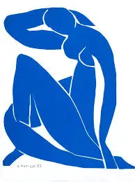 그는 컷오프 기법으로 스텐실 작품을 많이 탄생시켰어요. 그 중 가장 유명한 것이 바로 위의 2점 아닐까 싶습니다. 이번 앙리마티스 전의 브로슈어 표지 작품이기도 했던 '이카루스' 입니다. 태양에 닿아 날개가 녹아버리고 추락하는 이카루스를 표현했어요. 강렬한 파란색채와 그의 마음에 아직 뛰고 있는 붉은 심장이 아름답습니다. 노랗게 빛나는 별 혹은 태양빛도 함께 감상해주세요. 또한 오른쪽은 자유로운 포즈를 취하고 있는 인물의 형태를 자유롭게 재배치한 작품입니다. 이것을 푸른색감만으로 심플하게 표현하되 컷오프 기법을 사용해서 경계를 나타내고 있어요. 스텐실 작품입니다. 동일한 기법으로 표현된 연작이 더 남아있습니다.