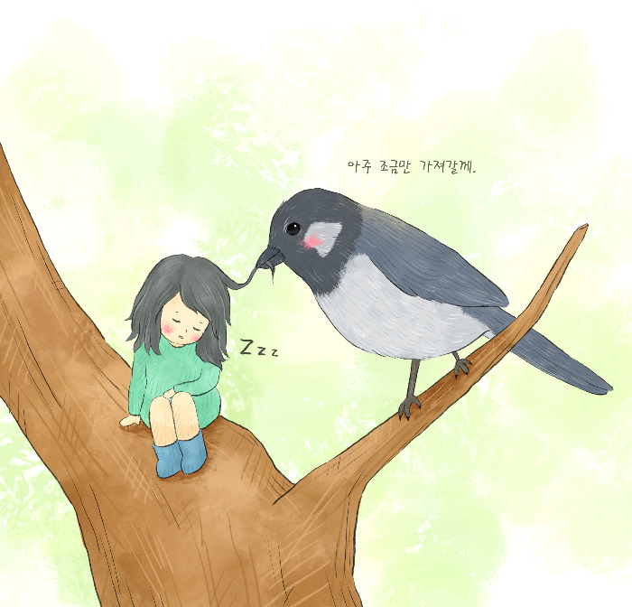 자는척하며 박새에게 머리카락 주기 <자연바라기 그림>