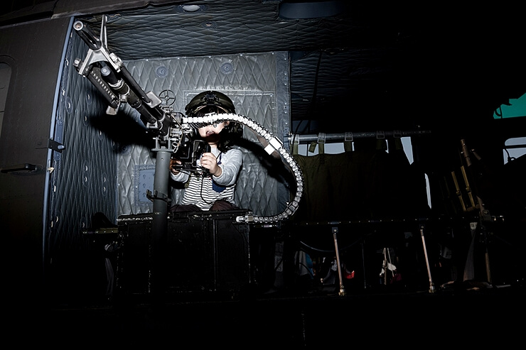 남자아이들의 로망인 총과 탱크를 실물 크기로 볼 수 있는 이 행사장은 세계 무기상들이 모여 계약을 체결하는 곳이자 가족들의 주말 나들이 장소이기도 합니다. 가족애와 주말의 낭만, 그리고 국가의 폭력 수단이 뒤섞인 공간에서 우리는 곧 전쟁과 분단이라는 역사적 사실이 우리의 일상 곳곳에서도 작동하고 있다는 사실에 대하여 마주하게 됩니다. 아이는 사진기 앞에서 천진하게 기관총을 발사하는 모습은 살생의 수단의 일종의 유희가 되어 우리의 일상에서 가볍게 치부되는 현실을 한 번 더 생각하게 하기도 하죠.