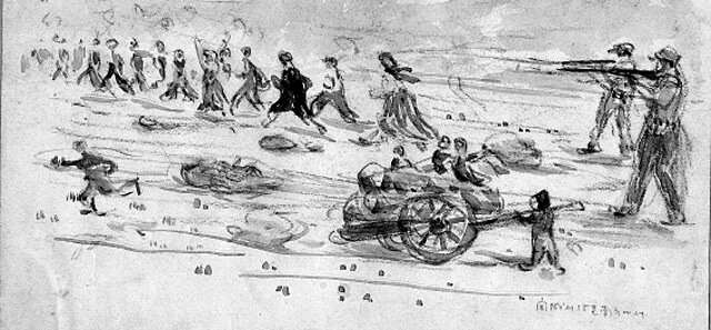 전시장을 거닐다 보면 한 구석 모여 있는 피란길 연작을 마주칠 수 있습니다. 피란길 연작을 그린 윤중식 작가는 평양 미술학교 출신이자 6.25 전쟁 당시 종군화가로도 활동했습니다. 작가는 빠른 필치로 여러 점의 피란길 연작을 그려 전쟁의 난리를 피해 고향을 떠나 피란길에 오른 사람들을 그림으로 생생하게 기록해왔습니다.