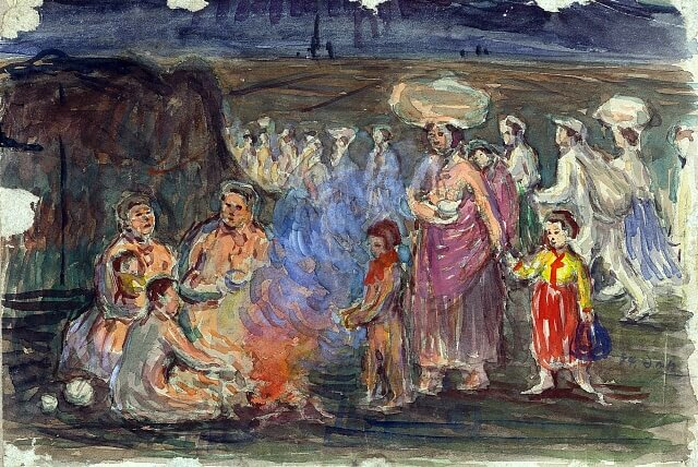 작가가 유독 피란길의 정한을 담은 그림을 많이 그린 이유는 무엇일까요. 그 이유는 작가의 개인적인 사정과 긴밀하게 연결되어 있습니다. 윤중식 작가는 가족들과 남으로 향하는 피란길에 올랐다가 그만 아내와 딸의 손을 놓치고, 홀로 가난 아이와 막내를 업고 부산까지 가야 했습니다. 가족을 잃고 자신에게 달린 어린 자식들을 데리고 홀로 부산으로 가야 했던 작가는 어떤 심정이었을까요.