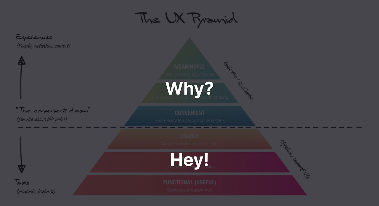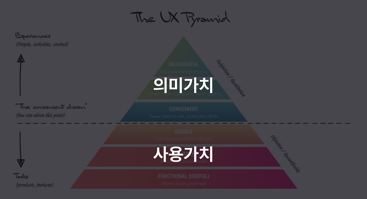 다르게 말하면, 사용가치와 의미가치로도 구분할 수 있다. 기반이 탄탄해야 피라미드가 무너지지 않듯이, 먼저 사용가치 기반을 튼튼하게 쌓아야 의미가치를 제공할 수 있다. 사용가치 기반이 튼튼하지 못한 피라미드에 의미가치를 쌓아올린들 쉽게 무너지고 만다.