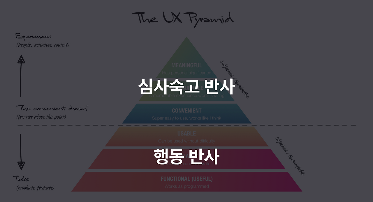 피라미드 위쪽의 편의성, 감성, 의미성 세 단계는 심사숙고 반사에 해당한다. 앞서 편의성은 개인화나 추천 등으로 사용자가 생각하지 못했던 좋은 정보/기능을 제공하는 것이라 했다. 이 단계부터 사용자는 필요한 기능을 사용하는 것을 넘어서, 서비스가 제공하는 무형의 가치에 암묵적으로 동의하게 된다.