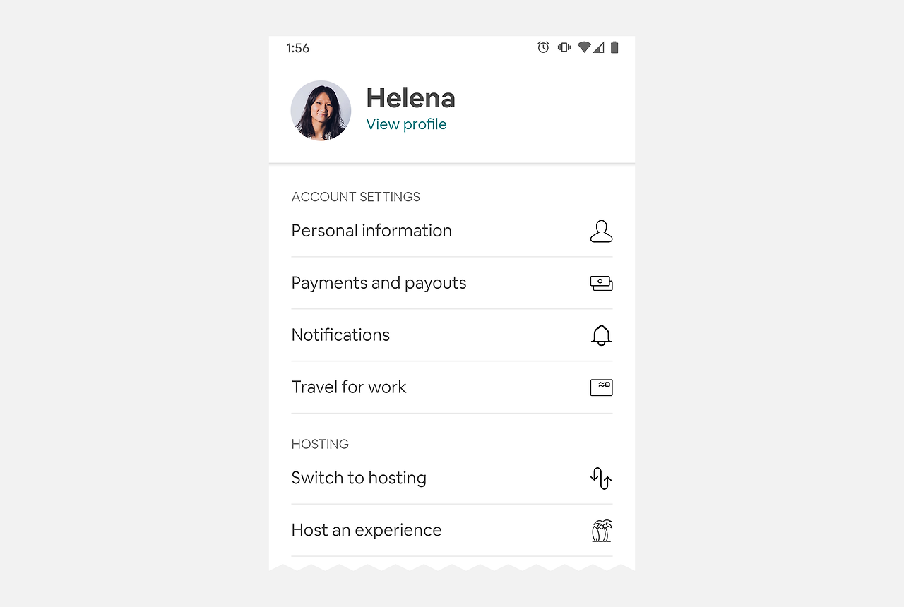 정렬만큼 간단한 것도 아이콘 작동 방식에 영향을 미칠 수 있습니다. 에어비앤비의 프로필 탭에서 아이콘은 오른쪽에 정렬되어 있고 아이콘이 나타내는 텍스트 라벨은 왼쪽에 정렬되어 있습니다. 이렇게 분리된 배치는 보는 사람이 두 요소를 연결하기 위해 앞뒤로 스캔해야 하는 작업을 더 많이 만듭니다.