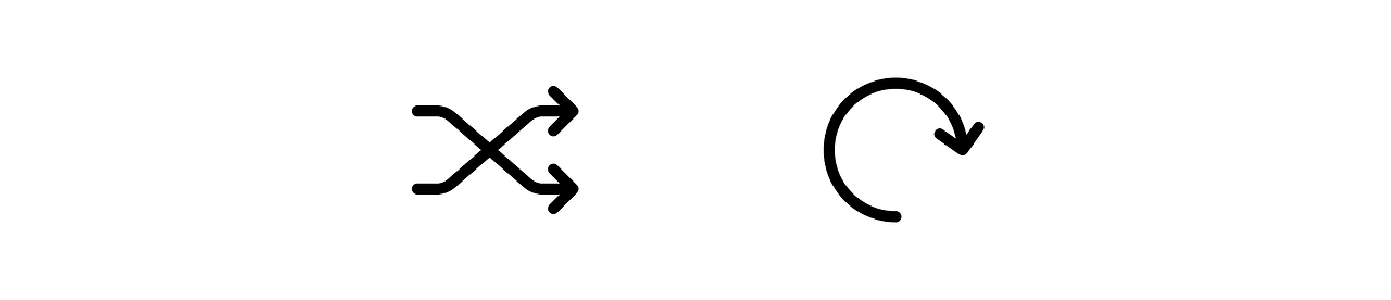 다른 경우에는 은유가 좀 더 추상적입니다. 셔플 아이콘과 새로고침 아이콘은 화살표의 움직임을 통해 그 의미를 전달합니다. 의미는 순서를 바꾸거나, 작업을 다시 수행하는 것입니다.