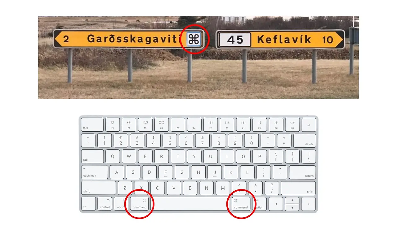 문화적 맥락은 아이콘의 의미를 변화시킵니다. 북유럽 도로 표지판의 프레첼은 관심 장소를 의미합니다. 애플 키보드의 동일한 아이콘은 명령 키를 의미합니다.
