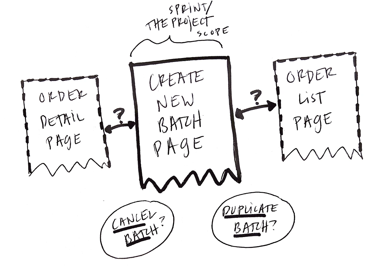 예를 들어 Create New Batch Page 디자인을 요청하면 BATCHES, ORDERS 및 ACCOUNTS 간의 연결을 표시합니다. 사용자가 새 일괄 처리 생성 페이지에 주문을 추가할 수 있지만 주문 목록 페이지에서 주문을 다중 선택 하고 거기에서 일괄 처리 생성을 시작할 수도 있는 방법을 언급합니다. 사용자는 주문 세부 정보 페이지에서 일괄 처리 초안에 주문을 추가할 수도 있다고 기대할 수 있는 점을 주의 깊게 살펴보세요.