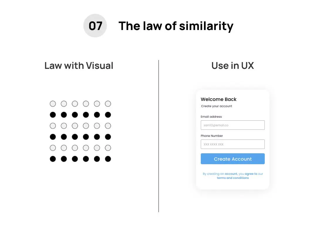 유사성의 법칙은 "사물이 서로 유사해 보일 때 우리는 그것들을 하나로 묶고 그것들이 연관된 같은 기능을 가지고 있다고 생각하는 경향이 있다."라고 말합니다.