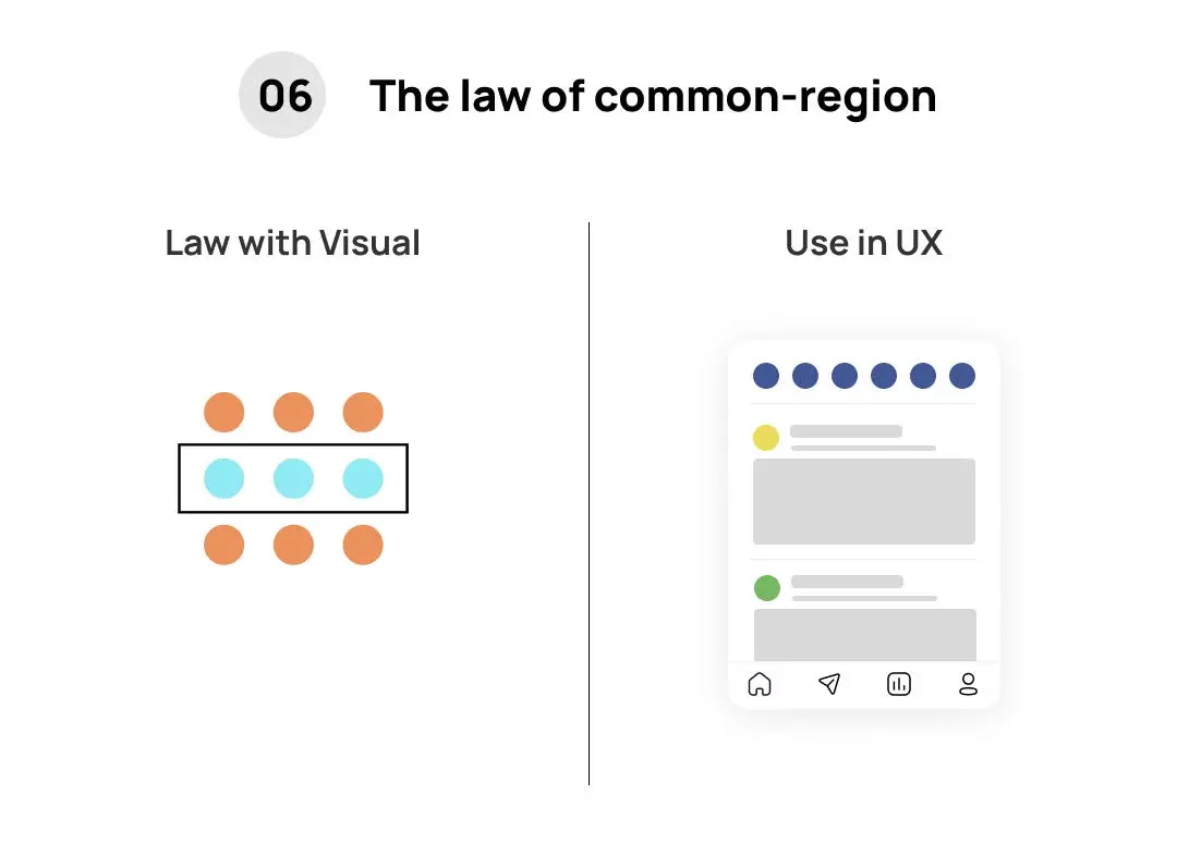 공통 영역의 법칙은 근접성의 법칙과 혼동되기도 합니다. “객체가 동일한 닫힌 영역 내에 위치할 때 우리는 그것들이 함께 그룹화되어 있다고 인식한다.”라고 말합니다.
