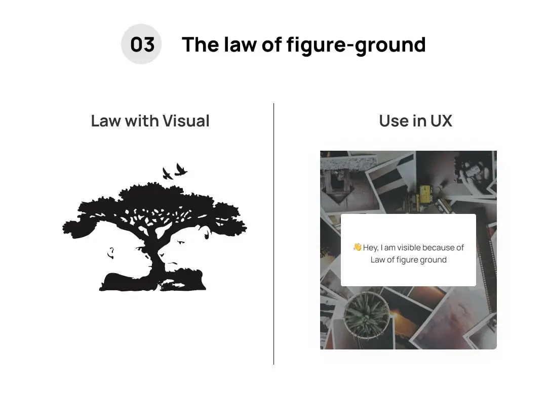 전경-배경의 법칙은 "사람은 본능적으로 물체를 전경 또는 배경에 있는 것으로 인식한다"라고 말합니다. (인간이 한 번에 많은 것을 인식할 수 없기 때문에 부분적으로 주목하는 경향이 있습니다)