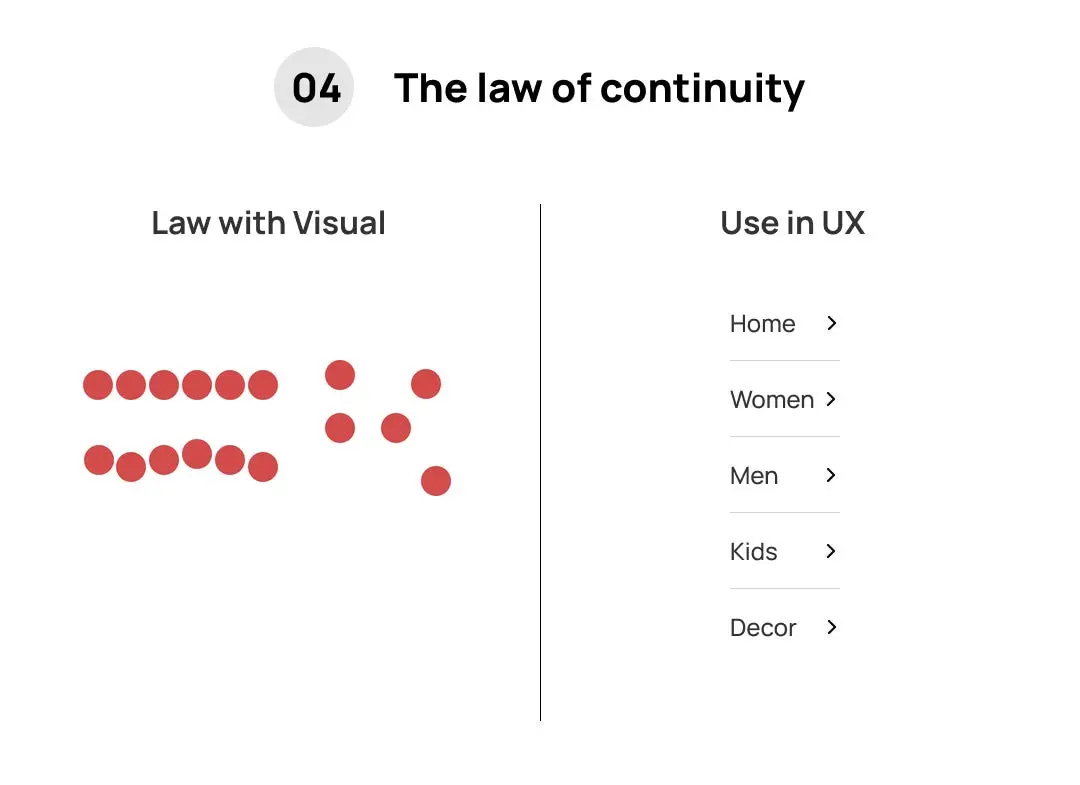 연속성의 법칙은 "선 위에 배열되거나 모양 윤곽선으로 배열된 요소는 무작위로 배치된 요소보다 더 관련성이 높은 것으로 인식된다."라고 말합니다.