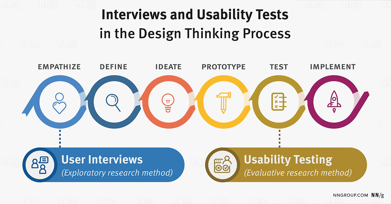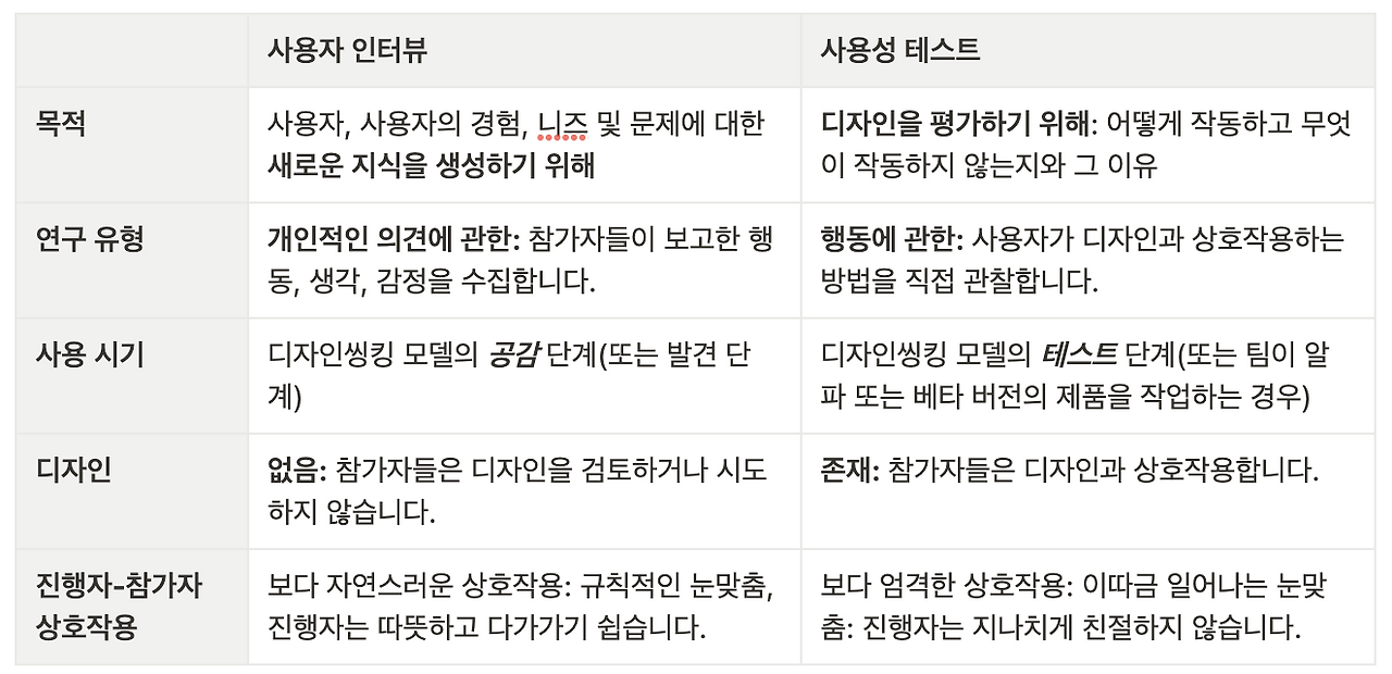 디자인 씽킹 프로세스에서 사용자 인터뷰는 초기 단계, 사용성 테스트는 후기 단계입니다.