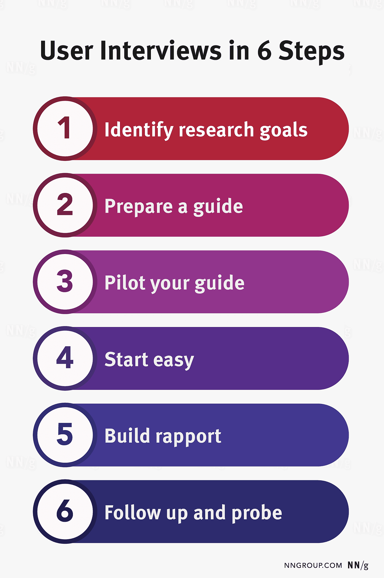 인터뷰는 사용자에 대해 알아볼 수 있는 인기 있는 방법입니다. 사용자의 생각, 행동, 심지어 필요한 것까지 알아볼 수 있습니다. 사용자 인터뷰를 비공식 채팅이 아닌 연구 조사처럼 다루세요. 가이드를 만들기 전에 연구 목표를 구성하세요. 인터뷰 중에는 참가자를 유도하지 않도록 주의하고 추가 질문으로 더 알아보세요. 마지막으로 사용자의 경험에 대한 정확하고 풍부한 그림을 얻기 위해 관찰 기반 연구로 인터뷰를 보완하세요.