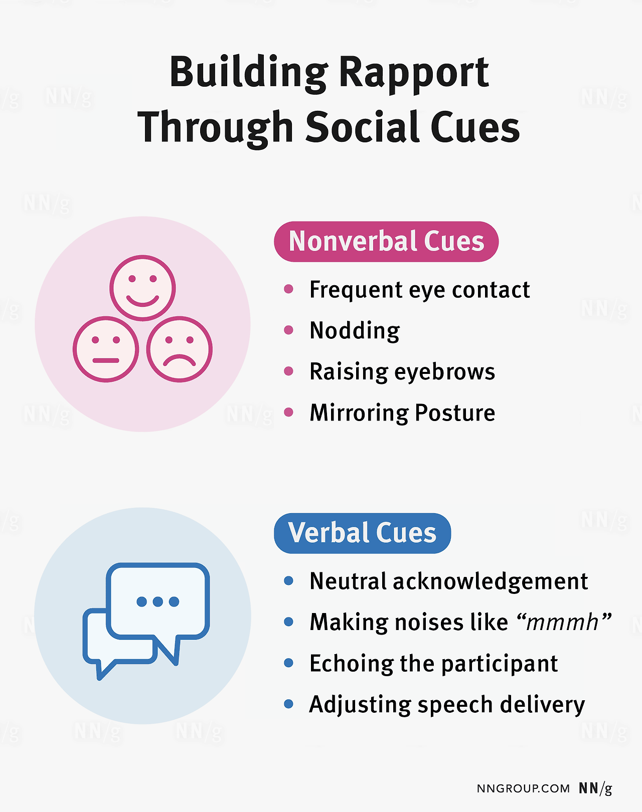 당신이 듣고 있음을 보여주고 관련 질문을 함으로써 라포를 형성하세요. 언어적, 비언어적 신호를 사용하여 듣고 있음을 보여줄 수 있습니다. 언어적 단서는 다음을 포함합니다.