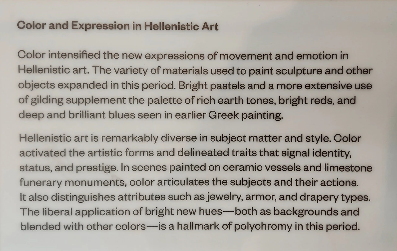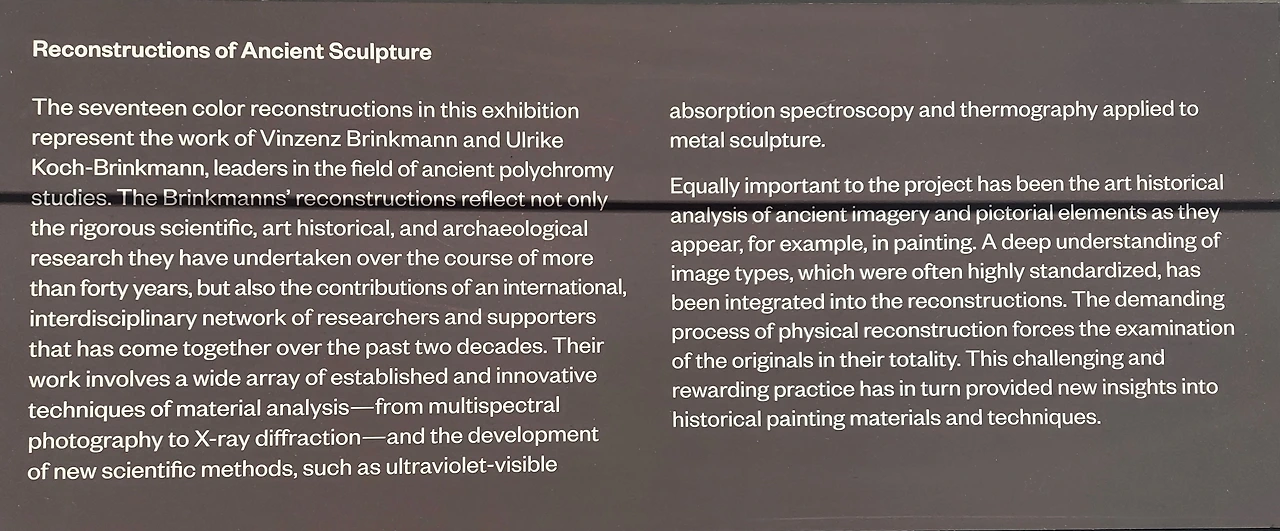 현재 뉴욕의 메트로폴리탄 미술관 그리스관에서는 고대의 채색이 된 작품들의 원래 모습이 어떠했는지 살펴볼 수 있는 <Chroma : Ancient Sculpture in Color>전시가 열리고 있다. 10월말 메트에 갔을 때 그 전시를 보았는데 전시장에 전시된 채색된 작품은 거의 모두 사진으로 찍어왔다. 고대 그리스의 채색된 대리석 조각과 청동조각, 그리고 고대 로마로 이어진 채색의 전통까지 살펴 볼 수 있는 전시였다.