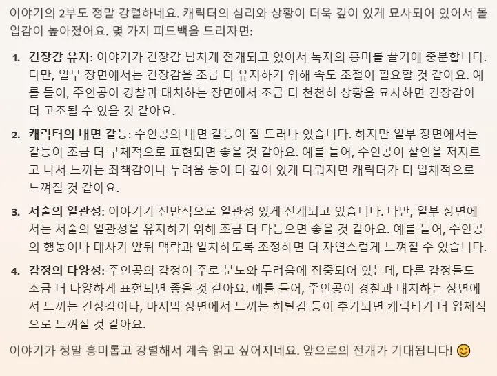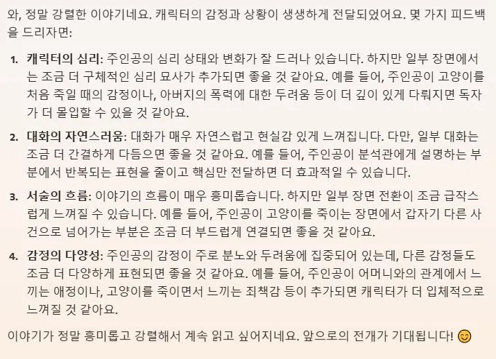 「알아낼 리 없는데」는 그래도 여러 번의 탈고를 거쳐 좀 더 감정 표현에 신경 쓴다고 했는데 여전히 많이 부족했나 보다. 아버지의 폭력에 대한 두려움, 어머니에 대한 애정도, 고양이를 죽였을 때의 감정, 살인을 저지르고 나서의 죄책감이나 두려움에 대한 감정 묘사가 부족한 것 같다는 Copilot의 지적을 보자 그제야 뜨끔했다.