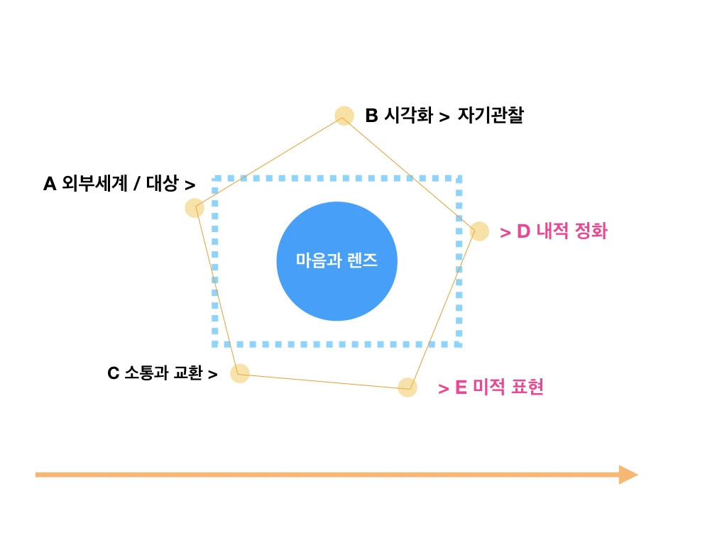 우리는 우리의 감각기관의 스크린에 맺히는 외부세계를 가정해 볼 수 있다. 그러나 그것은 전부가 아니다. 이것이 마음이라는 렌즈에 와 닿을 때는 좀 더 복합적인 관련성을 띠고 전달된다. 참여자와 진행자는 마음이라는 프레임에 몇 가지 고려사항을 가지고 관찰의 과정으로 이 프로그램을 진행해 나갈 수 있다. (학기나 프로그램에 이 요소들을 A부터 E까지 단계적으로 반영하여 시차를 꾸려볼 수 있다.)