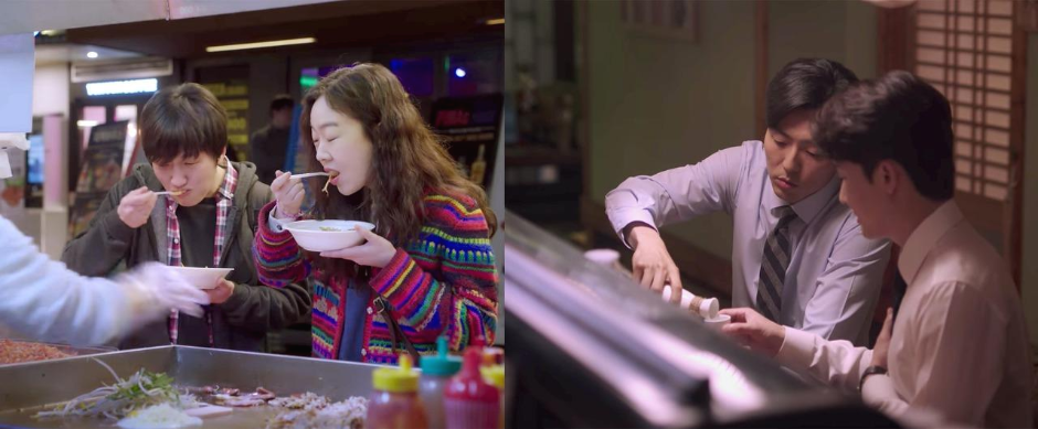 원래 한국 드라마는 식사 장면이 자주 등장하긴 한다. 그렇지만 이 드라마는 유달스럽게 먹는 장면에 눈길이 더 자주 가고 더 자주 비치는 것 같다. 데이터로 회당 먹는 씬 비율을 산출해 보지는 않았다. 그렇지만 주인공들이 진지한 핵심 관계를 발전시키는 씬에서는 먹는 장면이 등장하네? 단순 제작비를 줄이기 위해 드라마는 먹는 식당에서 이야기를 진행시키는 것이 일종의 관행이긴 한데, 여기서 등장인물들이 주고받는 눈길이나 유달리 따뜻한 분위기는 나만의 주관적인 시점인가? 회사원들의 비즈니스 공간인 일식집, 연인끼리의 결정적 대화를 나누는 식당, 친구들의 회식 식당, 동료와 수험생들이 시장을 여기저기 옮겨 다니는 공간에서의 먹방은 아무래도 눈길이 간다. 감독의 이전 작품 제목을 아예 '술 잘 먹는 예쁜 누나'로 바꿔 부르기도 했는데, 이건 어떤 인간적인 관계들이 무르익는 그 역할 공간을 보여주는 건가? 하는 생각을 하게 된다.