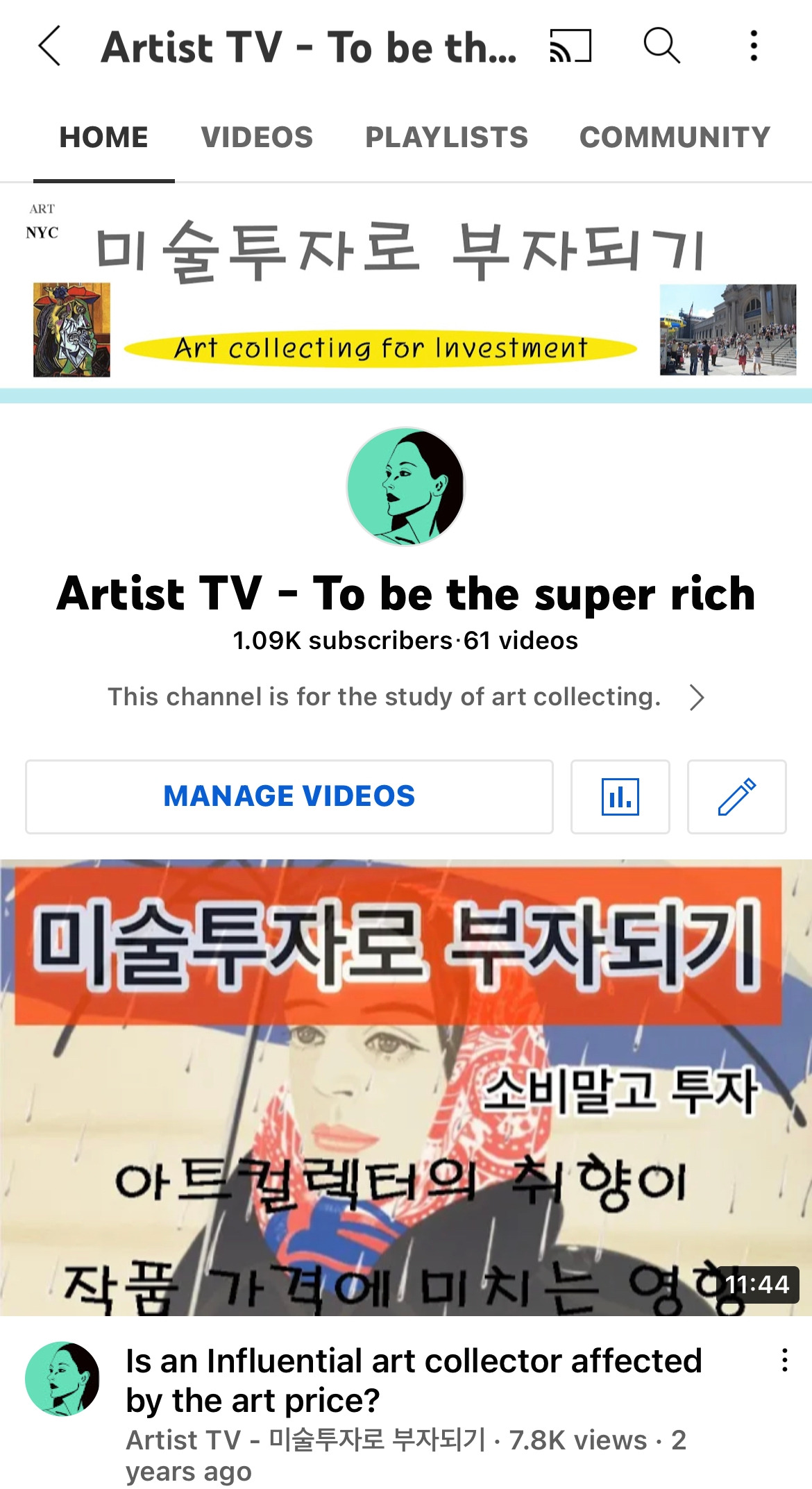 중, 고등학교 다니던 시절부터 만들어 온 미술 노트가 있었는데 미술사 수업시간에 수업내용을 꾸준히 기록하고 업데이트해 놓은 나만의 노트였다. 그리고 고등학교 미술 교과서는 버리지 않고 책꽂이에 항상 꽂아두었었다. 다른 교과서들은 학기가 끝나면 다 버렸지만 이 자료가 언젠가 나에게 중요한 해답을 제공할 수도 있다고 생각했던 것 같다. 그랬다. 모든 정답은 교과서에 있었다. 가장 기억에 남는 교과서의 구절은 훌륭한 작품은 반드시 시대적 대표성이 있어야 한다는 내용이었다. 작품성이 있어야 함은 너무도 당연한 일이다. 그런데 이 내용을 일반인들에게 설명한다면 쉽게 이해가 가능할까? 전혀 아닐 것이다. 예를 들어서 작품과 상황을 함께 설명해야 이해가 쉬울 것이다. 수학공식을 외운다고 해서 문제를 모두 풀 수 있는 것이 아니듯이 아트 컬렉팅도 연습문제와 응용문제를 계속 풀어서 감각을 익혀야 하는 것이었다. 이것이 <유튜브 Artist TV- 미술투자로 부자 되기>를 시작한 이유이다. 너무 분명하게 정리된 아트 컬렉팅의 정답과도 같은 내용인데 이것을 대부분 모르고 있다는 사실이 안타까웠다. 작품을 직접 보여주면서 쉽지만 짧게 내가 아는 모든 것을 알려줘야 되겠다 싶었다. 지금까지 총 60편이 넘는 영상이 업로드되었다. 그동안 1000명이 넘는 구독자가 생겼다. 다른 유투버에 비해 많은 숫자도 아니지만 1000명은 내 영상을 구독하고 있으니 적어도 1000명에게 이 영상이 도움을 주고 있다는 뜻이다. 감격스럽다. 그리고 생각지 않은 보너스들이 계속 생기기 시작했다. 전혀 연결고리가 없었던 좋은 사람들과 신뢰관계로 연결되었다는 점이다. 누군가 에게 도움을 주려는 마음을 내니 결국 나에게 부메랑이 되어 되돌아 온 것이다.