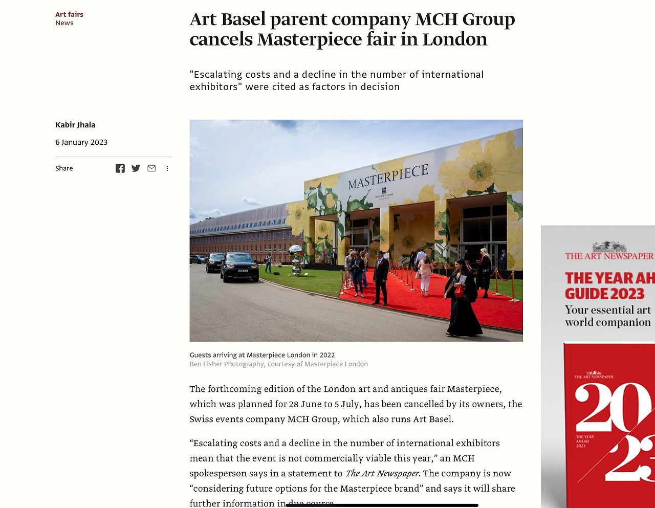 올해 아트 스테이지 싱가포르는 오랜 기간 문을 닫았다가 새롭게 오픈한다. 아트바젤의 모회사 MCH그룹이 15%의 지분을 인수 한 뒤 새롭게 단장을 한 것이다. 한편 런던 마스터 피스 페어는 행사를 돌연 취소 하였다. 마스터 피스 페어는 MCH그룹이 65% 이상의 지분을 소유하고 있다.