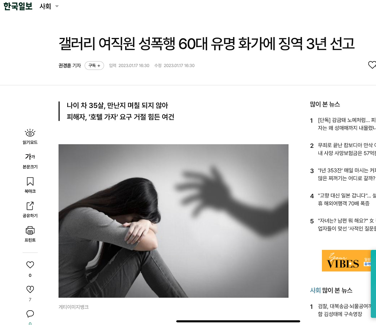 서울옥션에서 운영하던 부산의 한 갤러리에서 60대 화가 사 ** 씨가 갤러리 인턴을 성폭행했던 사건에 대한 판결이 나왔다고 한다. 그는 3년의 징역형을 선고받았다. 전시회가 열리던 기간은 코로나 팬데믹으로 늦게까지 문을 여는 식당과 바가 없어 호텔에서 술을 마시자며 여직원을 유인하여 범죄를 저질렀다. 가해자는 강제성이 없었다고 주장했지만 법원은 나이차이가 35살이나 나 연예감정을 느끼기는 어려워 보이며 피해자가 거절하기 힘든 여건이었음을 인지하고 징역 3년을 판결하였다. 피해자의 고통에 비해 처벌수위가 낮은 것은 아쉽지만 방송에 보도된 지 1년이 넘은 이 사건의 판결이 나와 다행이다. 가해자에 대한 법적 처벌은 경찰에 신고하여 발 빠른 대응을 하였기에 가능한 일이었을 것이다. 힘들었겠지만 이번 판결로 조금이나마 억울함을 해소할 수 있었으면 한다.