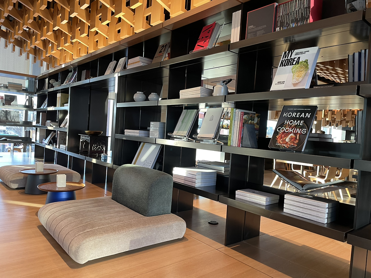 카페공간은 너무나 조용하고 여유로운 분위기라 약간 비싼 가격을 지불하고서라도 자주 들르고 싶은 곳이다. 자동차, 한식, 명품 브랜드에 관련된 서적들이 준비되어 있어 한국식 마루에 앉아 천천히 차를 즐기며 책을 볼 수도 있다.