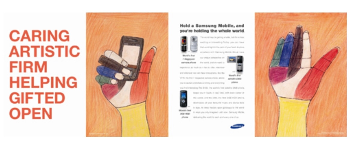 삼성의 브랜드 가치가 소니를 넘어선 역사적인 순간이 있었다. 2006년 그 해는 이건희 회장의 업적이 역사를 이루는 순간이었고 한국 산업에 대 전환점이라고 할 수 있는 시점이기도 했다. 한국인에게는 잊을 수 없는 순간으로 기록되는 그때를 함께했던 지구 저편의 나라에서 온 아티스트가 있었다. 그는 코트디 부아르의 세종대왕으로 불리는 프레데릭 브룰리 부아브레 Frédéric Bruly Bouabré(1923-2014)이다. 삼성은 애니콜을 내어 놓으며 전 세계 휴대폰 시장을 점령하겠다는 원대한 목표를 세웠다. 이건희 회장은 연예인이 등장하는 광고 말고 좀 더 고급스럽고 의미 있는 홍보를 하길 원했고 프레데릭 브룰리 부아브레의 ‘무지개 빛 관대한 손’ 조형물로 제작해 20개 넘는 국제공항에 설치하였다. 그의 작품 ’ 무지개 빛 관대한 손‘ 이 애니콜을 쥐고 있는 이 조형물 광고는 대성공이었다. 애니콜은 기존의 저렴한 삼성의 이미지 대신 고급스럽고 세련된 이미지로 거듭나게 해 주었다. 이 아티스트 콜라보는 지금의 세계적인 삼성 브랜드 가치를 만들었던 시발점이라 여겨진다.