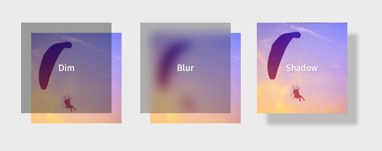 시각적 깊이를 표현하는 One UI의 대표적인 계층적 구조 표현 방식은 blur, dim, shadow등이 있다. 각각 흐릿하게 하는 효과, 어둡게 하는 효과, 그림자 효과로 볼 수 있다. 해당 효과는 과하게 사용해서는 안되며, 컨텐츠의 가독성에 방해가 되어서는 안된다.