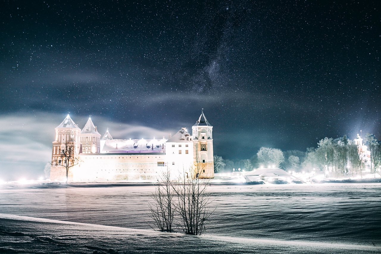 깜깜한 밤 저 멀리서 힐끗힐끗 푸른빛이 보인다. 첫 번째 목적지에 가까워질수록 아롱 한 빛들이 선명하게 그림을 그리기 시작하더니, 아름다운 얼음성을 지어냈다. ‘미르성’은 유네스코가 2000년도에 세계문화유산으로 지정한 곳으로, 15세기에 지어진 고딕 건축양식의 아름다운 성이다. 얼마 뒤엔 르네상스 양식으로, 이어진 전쟁의 포위공격 뒤로 바로크 양식으로 확장, 재건축되었다.