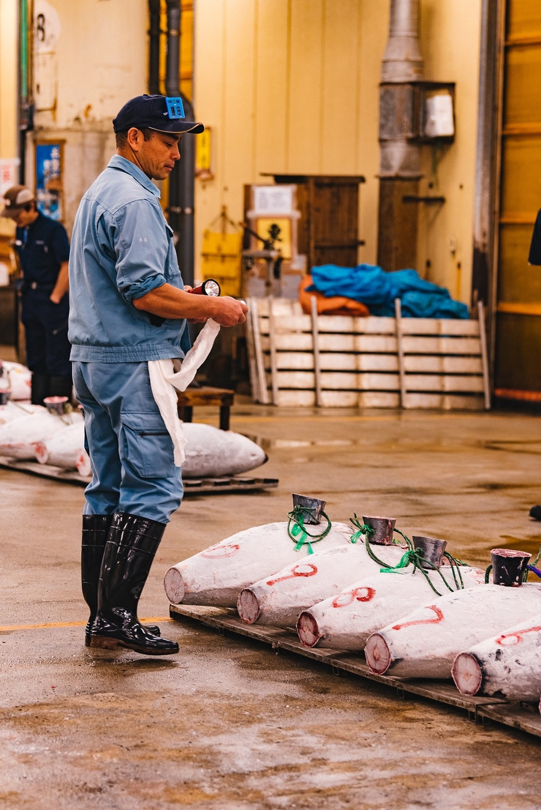 경매현장은 사뭇 진지하다. 심지어 늘어서 있는 참치들 마저 경건하고 진지하게 여겨진다. 조금 전 안내인인 코세 상에게 이들의 가격이 어느 정도 인지 들어서 그런 걸지도 모르겠다. 경매에서 거래되는 참치의 가격은 적게는 몇 천 만원에서 많게는 수 억 원에 이르는데, 올해 1월 1일에는 212kg짜리 아오모리산 참다랑어가 1999년 이후 두 번째로 높은 가격인 7,420만엔에 낙찰되었다고 한다.