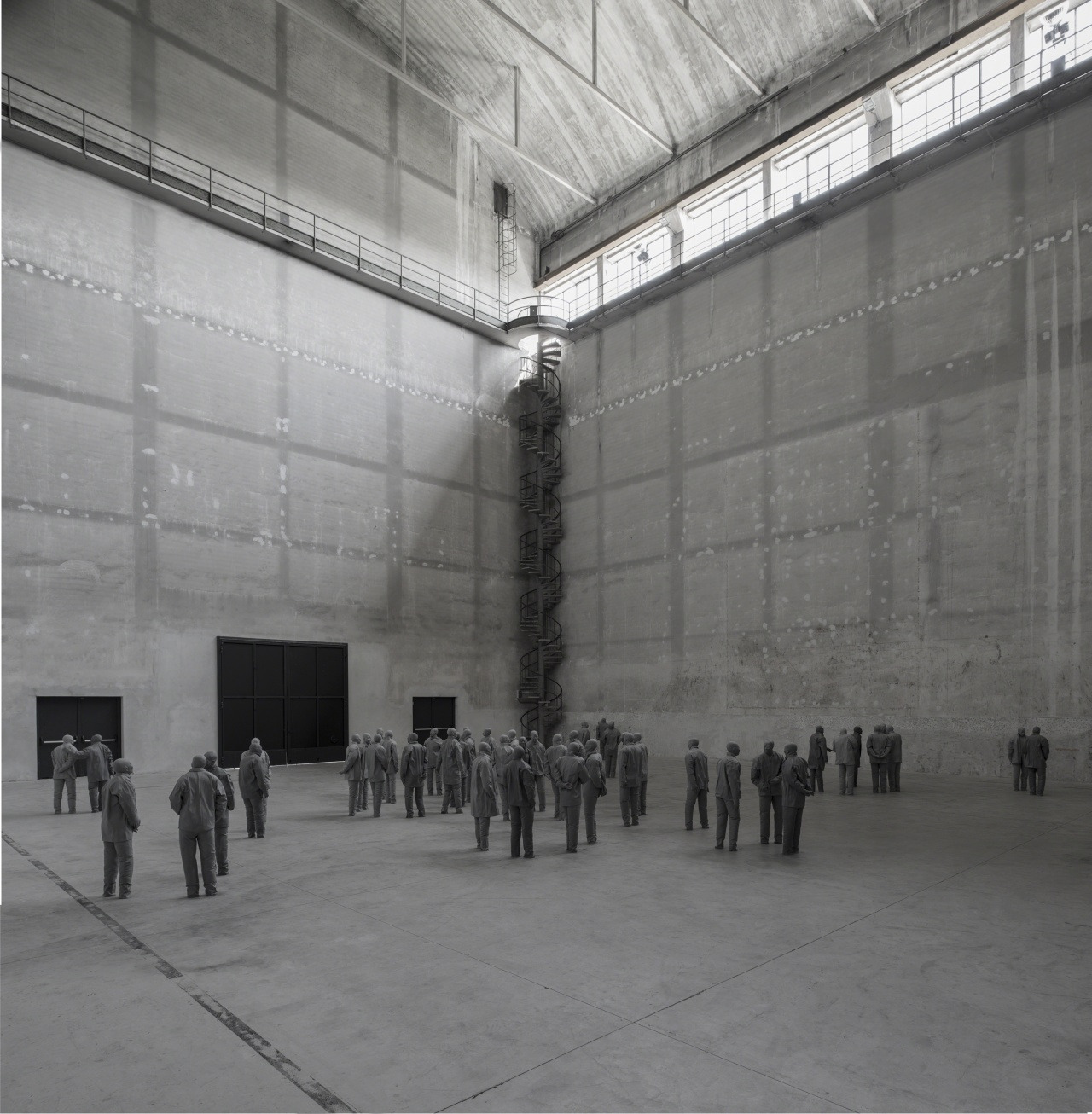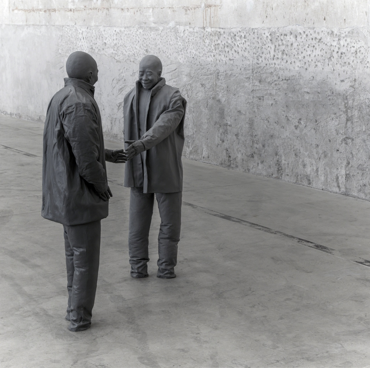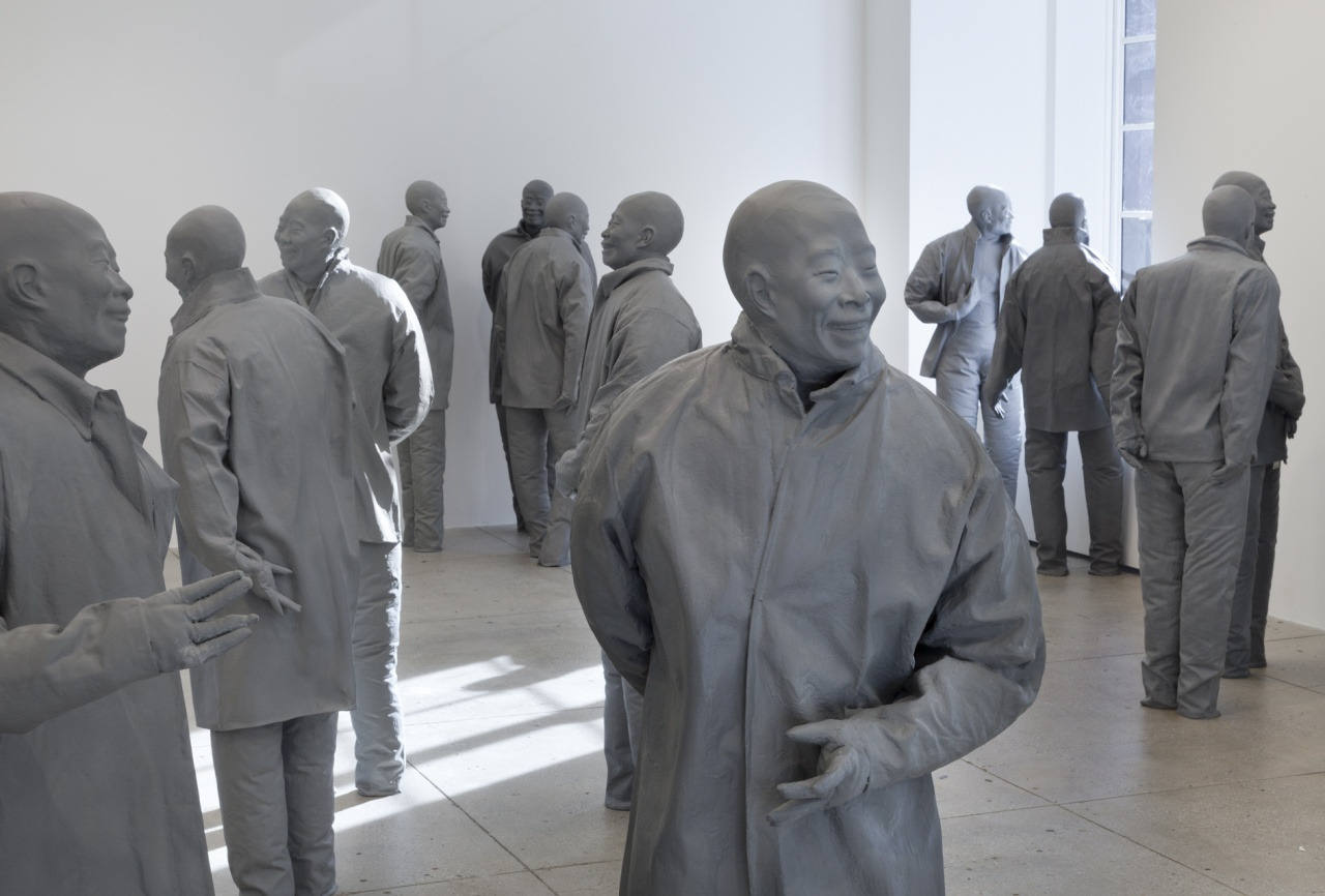 Juan Munoz, Many times, 1999, polyster resin 145x40x40cmⒸJuan Muñoz. Photo Jean Luc Lacroix 무노즈의 가장 유명한 작품 <Many times>이다. 145센티 키를 가진 백 명이 모여있다. 색은 무광 회색, 웃고 있는 아시아인이다. 무노즈는 이들을 중국인이라고 말한다. 모두 대머리에 눈을 감고 있다. 관람객들은 이들 사이를 헤집고 다니며 그들의 표정을 관찰한다. 어떤 표정을 하며 대화하는가, 서로 인사를 하는 사람들, 악수하는 이들, 서로를 비웃는 표정인가 살펴본다. 자세히 보지 않으면 놓칠 수 있는 것이 있다. 모두 발이 없다. 그들의 신체는 머리부터 발목까지이다.