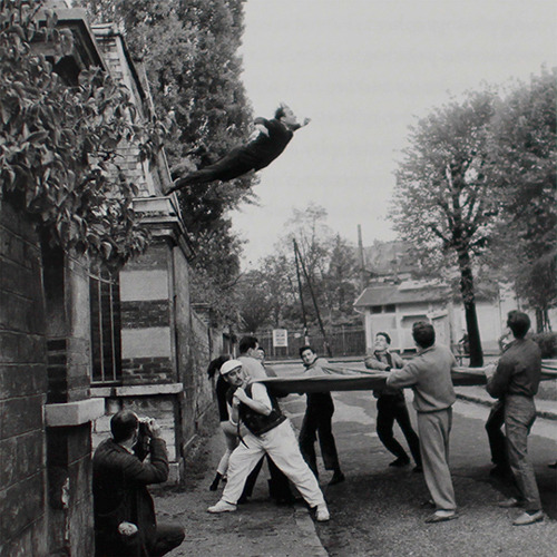 Yves Klein, Leap into the Void, 1960, Photo:Harry Shunk, János Kender유년기 상상하던 꿈을 실행에 옮겼다. 1960년 10월 아침 세탁해 둔 검은 양복을 입었다. 아트 딜러 집으로 갔다. 클라인 부인과 친구들이 함께 모였다. 클라인은 2층 지붕으로 올라갔다. 몸을 던졌다. 길에서 친구들이 방수포를 들고 있었다. 몸을 던지고 또 던졌다. 허공에서 몸 곡선이 자신이 생각하는 포즈로 나와야 했다. 사진작가 해리 슝크 Harry Shunk와 존 켄더John Kender가 사진 찍었다. 이후 암실에서 사진을 잘라내고, 접착, 재배열, 겹치는 과정을 거쳤다. 아무도 없는 텅 빈 거리 이미지가 탄생했다.