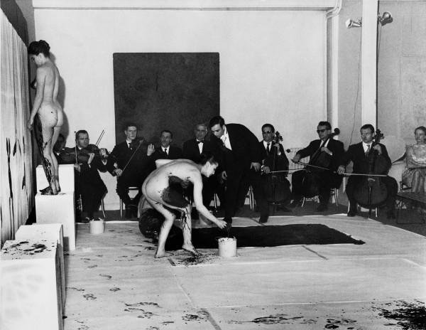 이후 이브 클라인은 1960년 2월 파리 한 아파트에서 공연했다. 일곱 명의 클래식 연주자들을 불렀다. 관객들은 의자에 앉아 있었다. 클라인이 연주자들에게 연주를 지시하자 <모노톤 침묵 심포니 Symphonie Monoton Silence>를 시작했다. 이 곡은 그가 작곡했다. 한 코드만 20분 연주되고 이후 20분은 침묵한다. 연주하는 동안 누드모델 세 명이 등장했다. 클라인의 사인을 받고 옷을 벗었다. 온몸에 파란 페인트를 칠했다. 벽에 걸린 종이에 몸을 찍었다.