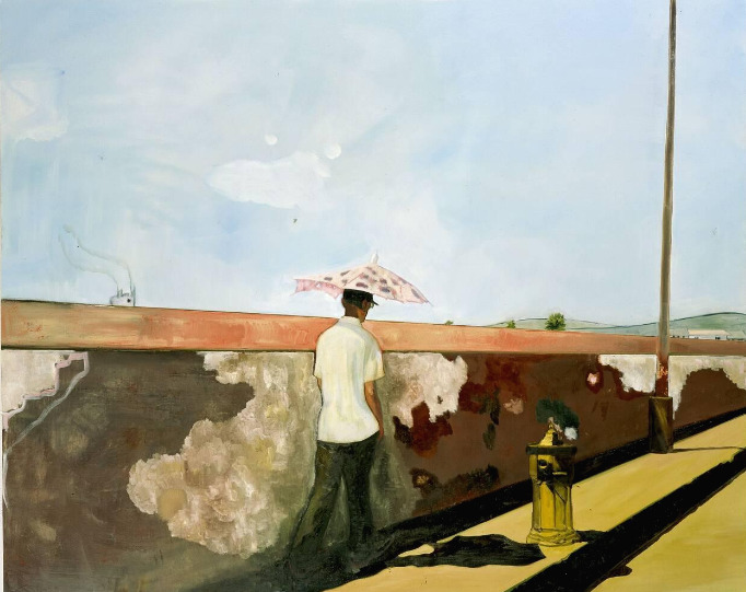 2002년 섬에 도착한 도이그는 카메라를 들고나갔다. 지나가는 남자의 뒷모습을 찍었다. 남자는 저 멀리 사라지는 시점 속으로 걸어간다. 하늘, 길, 벽, 공기, 빛만 있다. 앞을 막 지나갔을 남자. 혼자 걷는다. 도이그 작품들에는 혼자 있는 인물이 많다. 분홍색 작은 우산을 들고 햇빛을 피해 담벼락 그림자를 밟으며 걷는다. 적막한 마을의 기운이 감돈다. 붉은빛이 도는 담장은 정적인 시간 속 동적인 남자의 발걸음에 힘을 더해주고 있다.