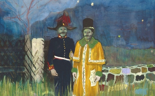 Peter Doig, Gasthof zur Muldentalsperre, 2002-2004, Oil on canvas, 196x296cm Image:wikiart <가스타우스 추어 멀든탈슈페레 Gasthof zur Muldentalsperre>에서 마술적 사실주의가 나타난다. 오로라가 펼쳐진 밤하늘 풍경이다. 두 남자가 알록달록한 벽돌 길 앞에 서 있다. 얼굴색은 청색이다. 비현실 속 인물처럼 느껴진다. 꿈의 한 장면을 보는 듯 몽환적인 분위기로 거대한 캔버스를 채운다.