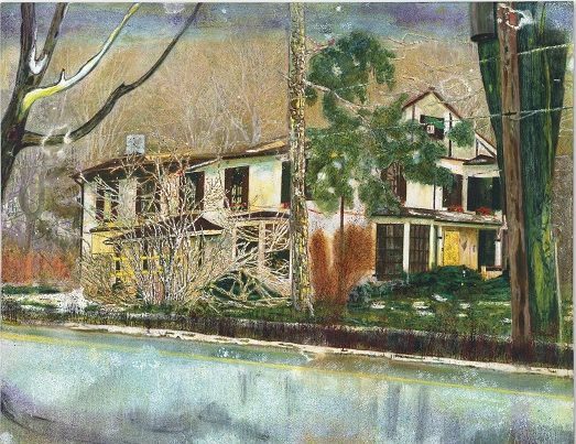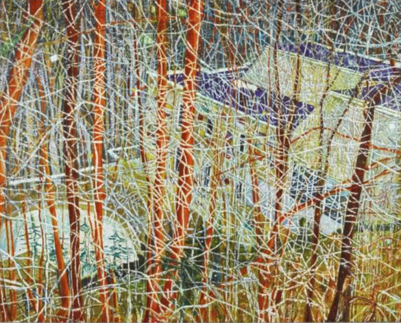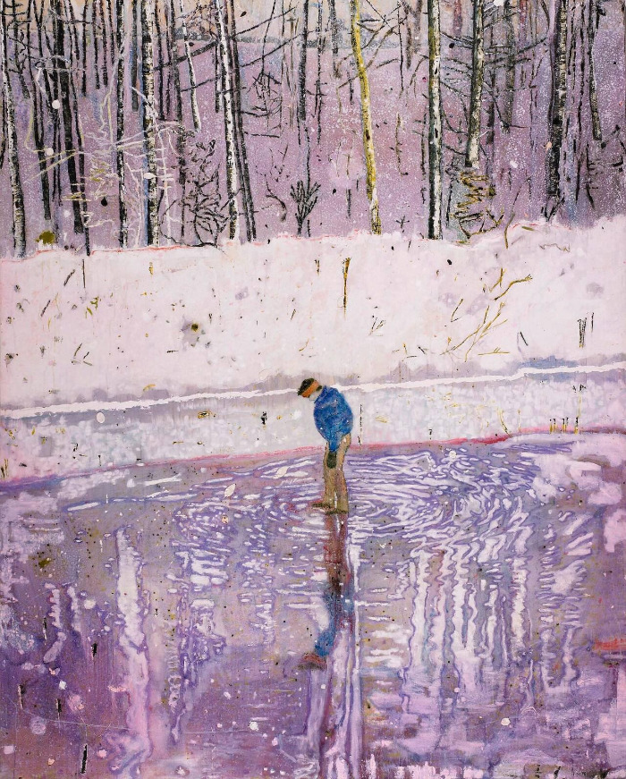 Peter Doig, Pine House(Rooms for Rent),1994, Oil on canvas 180x230.5cmⓒChristies.com2014년 11월 뉴욕 크리스티 경매에서 18 밀리언 달러에 낙찰된 <소나무 집>이다. 화재로 소실된 집터에 새 건물이 들어선 것을 본 도이그는 폐허가 되었던 이전 모습을 떠올리며 작업했다. 도로에 얼어있는 빙판 위로 집이 반사된다. 집 일부분은 푸른 나무에 가려 보이지 않는다. 겨울과 여름이 함께 공존하는 느낌이다.