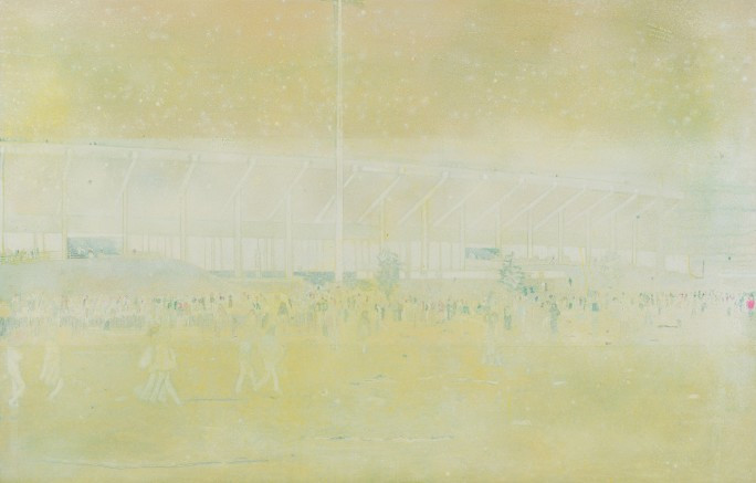 Peter Doig, Buffalo Station II, 1998-98, Oil on canvas, 269.9x69cm Private Collection,LondonⓒSotheby1960, 70년대 컨트리 록이 유행했다. 1978년 롤링 스톤은 <Some girls> 앨범 미국 순회공연을 하고 있었다. 음악을 좋아했던 19살 도이그는 차를 끌고 토론토를 출발했다. 몇 시간을 운전해 미국 리치 스타디움 Rich stadium 공연장에 도착했다. 친구들과 사진을 찍었다. 20년이 지난 후 사진을 보며 그날의 공연장을 그렸다.