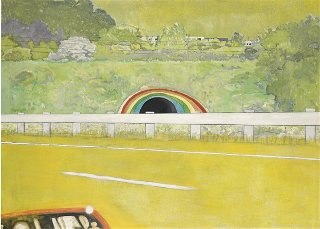 Peter Doig, Country-rock (Wing mirror), 1999, Oil on canvas, 194.9x270cm, Image:artnet.com2014년 6월 런던 소더비에서 14.5 밀리언 달러에 낙찰된 <컨트리 록 Country-rock>이다. 노란색 도로와 풍경을 가로지르는 흰 바리케이드, 뒤로 무지개가 보인다. 우리는 상상을 해본다. 무지개가 진짜 그곳에 있을 수 있을까. 있는 날이었나? 검은색 때문에 단순히 터널일 수도 있겠다 싶다. 르네 마그리트의 <피레네의 성>에서 거대한 돌이 하늘 위에 떠있었다. 도이그의 무지개는 지면에 붙어있다. 있어야 할 곳에 있지 않고 엉뚱한 곳에 두어 익숙한 것을 낯설게 한다.