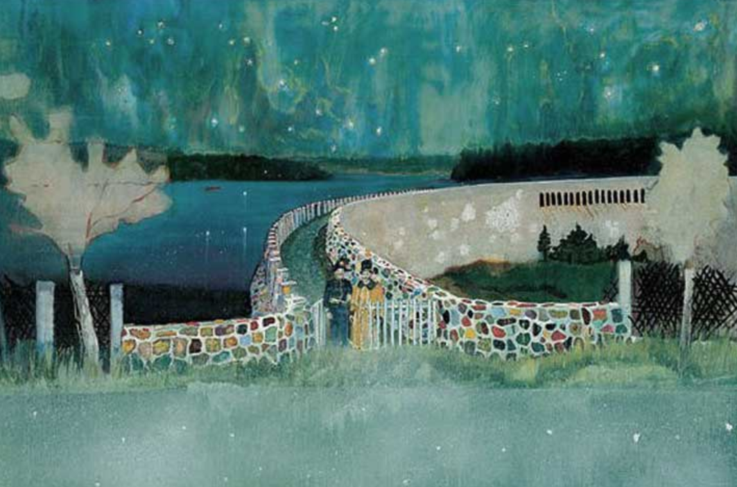 도이그는 사진을 인물 스케치나 연구 자료로 사용했다. 가지고 있던 풍경화 엽서 사진과 직접 찍은 사진을 합했다. 서로 다른 사진을 합해 도이그만의 풍경화를 완성했다. 경치는 묘한 색채로 변했다. 연극 무대 위 서 있는 배우들 같다. 저 돌다리를 건너면 또 다른 세계가 있는 듯 상상하게 만든다. 작품 제목은 독일의 한 주점 이름에서 따왔다.