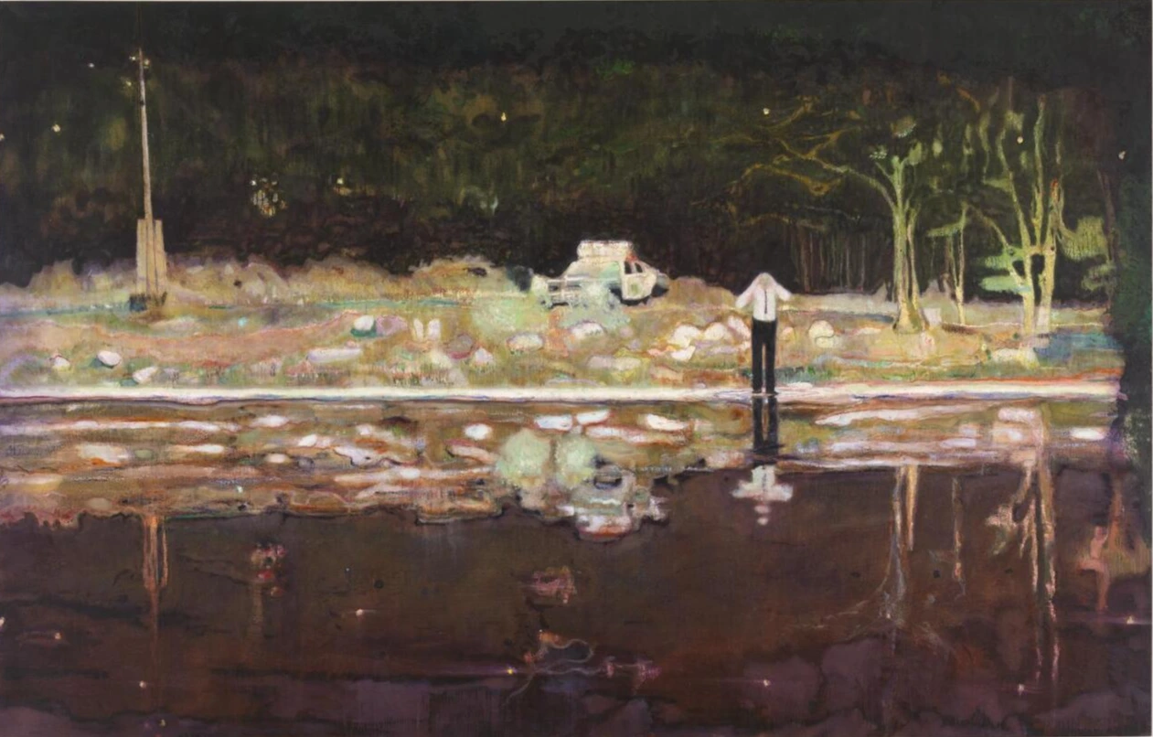 캔버스를 가로지르는 흰 수평선이 보인다. 90년대 다른 회화들처럼 색으로 전체적인 구성을 나누고 있다. 수평선 위로 흙, 무성한 잡초를 파스텔색으로 표현했다. 그 뒤 미국식 경찰차가 있다. 차 위로 밝은 빛이 난다. 빛은 오른쪽 곧게 뻗은 나무 높은 곳까지 비춘다. 나무 끝은 반대편 전신주와 수평을 이룬다. 흰 셔츠에 검은 바지와 넥타이를 맨 남자는 뭉크 그림 속 여자처럼 두 손으로 얼굴을 감싸고 있다. 우리를 향해 소리친다. 어둡고 텅 빈 호숫가는 남자의 메아리로 가득 찬다. 물결 위로 풀과 남자 모습이 반사된다. 발 주변으로 작은 물결이 일고 그림자가 비친다. 도이그에게 물은 다른 세계로 들어가는 입구와 같은 역할을 하는 자연물이다.