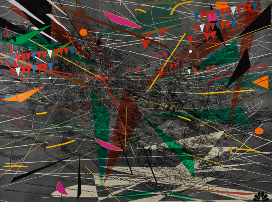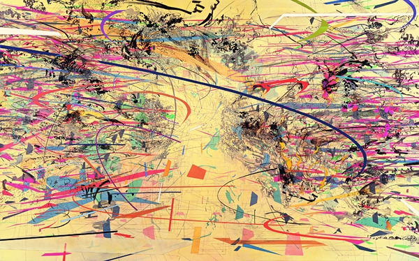 이 작품 <Dispersion>은 기하학적 색채 모양과 소용돌이치는 선들이 결합한 지형도면처럼 보인다. 혼란스러운 선들은 해체되는 동시에 다시 모이는 통제된 혼돈이다.