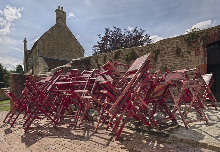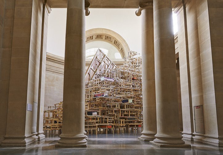 Phyllida Barlow: untitled: 겹겹이 쌓인 의자 courtesy Hauser & Wirth Photo:itsnicethat.com발로우는 우연성을 사용한다. 머릿속에서 계속 무엇인가 찾으려 한다. 우연성, 사건, 실수, 이런 것들을 모은 비논리적인 것을 좋아한다. 치밀하게 계획하고 설계하지 않은 작품들이다. 조각은 건축물 안에서 장식이나 배경 역할을 하지만, 그녀의 조각은 건축물을 압도한다.