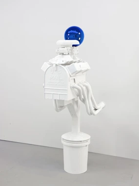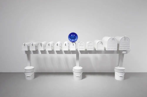 우편함 Mailbox, 2013, plaster and glass 188.6x61.9x105.4cmⓒJaff Koons.com이 작품에서 푸른 볼이 인상적이다. 제프 쿤스는 어린 시절 펜실베이니아에서 집마다 문 앞 우편함과 작은 정원들에 동그란 거울과 같은 볼이 있는 것을 보았다.