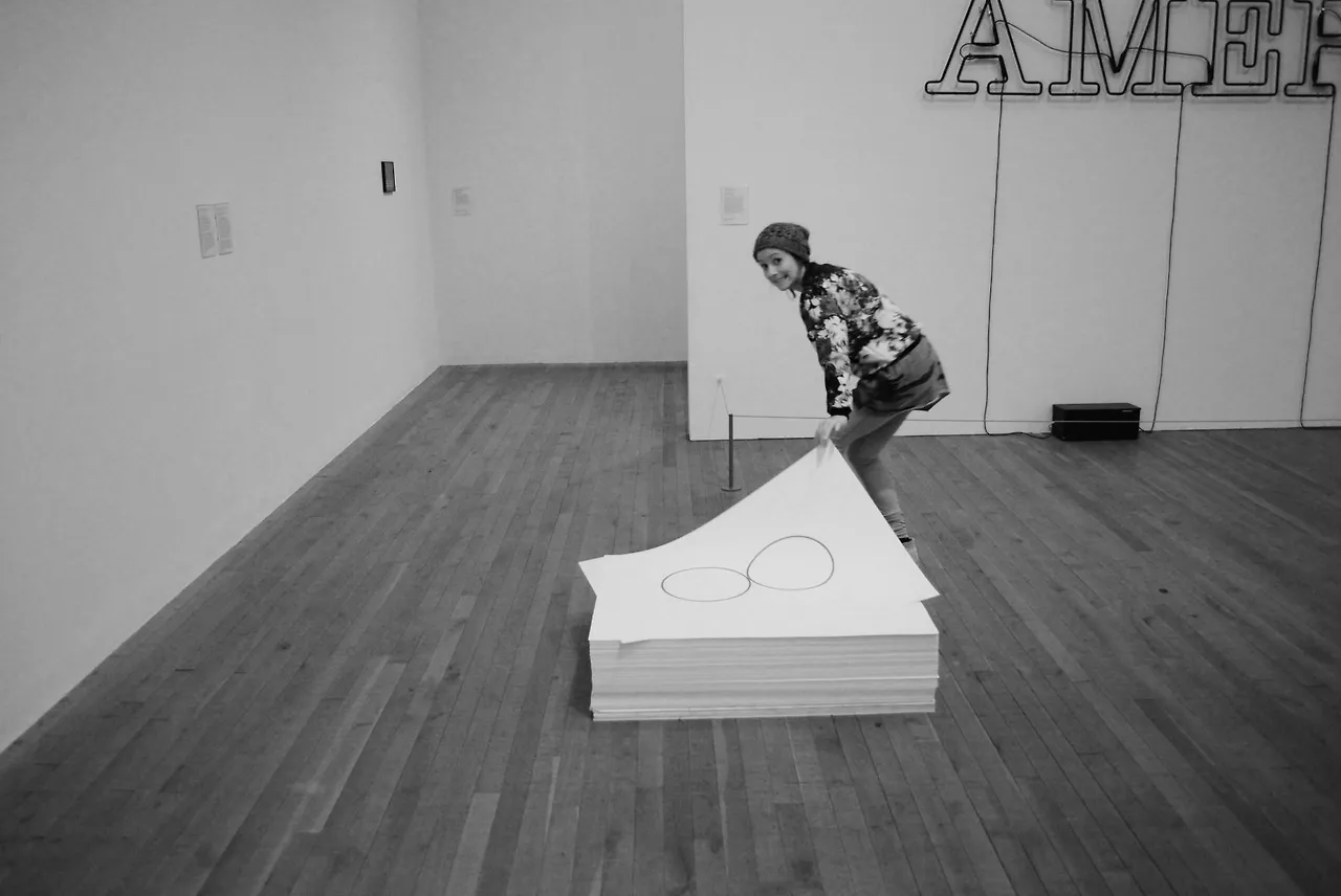 작품 ‘베테랑 데이 세일’과 ‘메모리얼 데이 위켄드’는 매년 11월과 5월에 돌아오는 미국의 국정 공휴일인 재향군인의 날, 그리고 전몰장병 기념일에 대해 이야기하고 있는 작품입니다. 사실 작품에서는 흰 종이 중앙에 작은 글씨로 ‘베테랑, 데이, 세일’ 그리고 ‘메모리얼, 데이, 위켄드’라고 적혀있을 뿐이에요. 호국영령을 기리기 위한 기념일에 죽음을 기념하기보다는 ‘쇼핑’을 하는 모습, 대대적인 세일 기간의 경쾌한 광고들, 관객은 별다른 언급 없이 세 개의 단어로만 이루어진 작품 한 장을 집어 들고 그 작품을 또 다른 장소로 가져가게 될 텐데요, 작품의 의미는 계속해서 재생산되고 공유되겠죠.