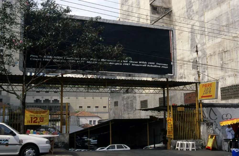 1989년 공공미술 기금의 지원을 받아 뉴욕의 세리든 광장, 크리스토퍼 스트리트 등에 설치되었던 이 작품은 보시는 것처럼 검은색 바탕에 흰색 글씨로 무언가 적혀 있죠. 작품을 자세히 보면, ‘에이즈 연합 1985 경찰의 가혹행위 1969 오스카 와일드 1895 대법원 1986 하비 밀크 1977 워싱턴 행진 1987 스톤월 항쟁 1969’라고 적혀있습니다. 에이즈 연합회가 설립되었던 1985년, 동성애자들에 대한 경찰의 가혹행위 1969년, 소설가 오스카 와일드가 동성연애로 피소되었던 1895년, 대법원이 동성애 문제에 불리한 판결을 내린 1986년, 동성연애 지지운동을 벌였던 하비 밀크가 상원의원이 되었던 1977년, 워싱턴에서 게이 권리를 위한 거대한 시위가 일어났던 1987년, 그리고 1969년 게이 권리를 위한 운동을 촉발시켰던 스톤월 항쟁을 나타내는 문구들이죠. 동성애에 대한 주요 사건들을 공공장소에서 언급하면서 소수자의 권리와 인권에 대해 이야기하고 있습니다.