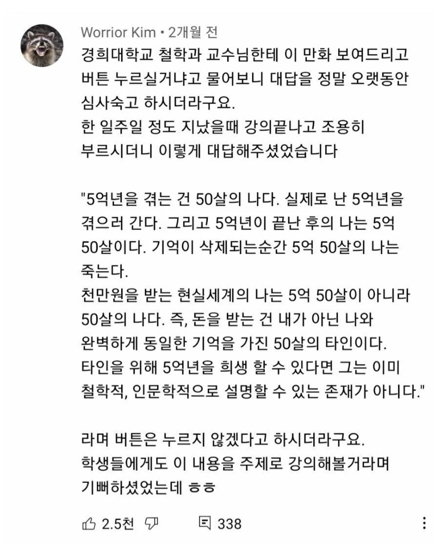 뭐가 어쨌든 간에 나 자신이 5억년이라는 긴 시간을 보내야 한다는 사실이 두렵기에 버튼을 누르지 못한다.라는 의견이 많아지기 시작합니다.