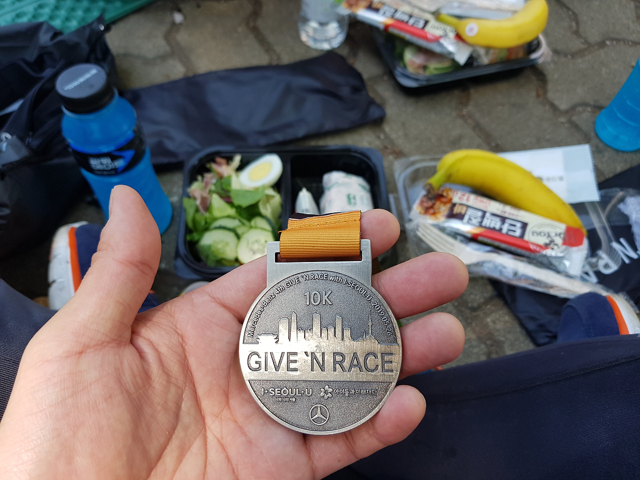 그렇게 9킬로를 넘어 결승선에 도달하기까지 목표가 생긴 나는 머릿속 경쟁을 하며 그 누군가와 엎치락뒤치락 피 터지게 싸웠고 천천히 일정한 속도로 꾸준히 달렸던 그와 잠시 쉬어가면서 빠르게 달렸던 나의 경쟁은 결국, 5초 정도 먼저 들어간 그의 승리로 마무리되었다.