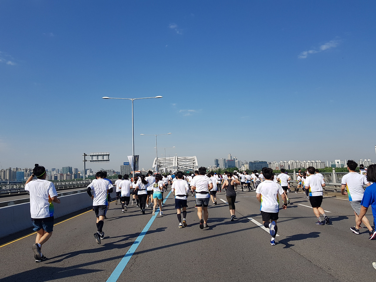 차량이 통제된 양화대교 위를 달리는 기분도 정말 일품이었다. 차로만 다니던 다리 위를 뛰고 있노라니 참 신선한 기분이 들어 뛰는 와중에 연신 셔터를 눌러대며 사진을 찍었다. 그렇게 달리기 시작한 지 5킬로가 넘어가자 슬슬 숨이 가빠오는 느낌이 들기 시작했다.