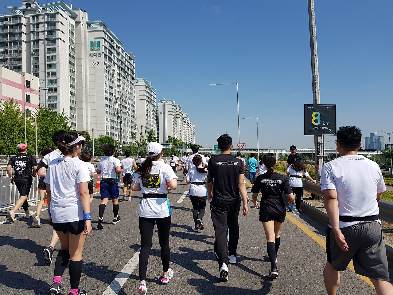 8킬로가 조금 넘었을 때, 오른쪽 무릎이 조금씩 아파왔다. 연습을 좀 더 했었으면 좋았을 걸 하는 아쉬움도 밀려왔다. 힘들다고 그냥 주저앉아 쉬고 싶지는 않고 그렇다고 너무 무리하면 안 되겠기에 뛰는 대신 빠른 걸음으로 걷기 시작했다.