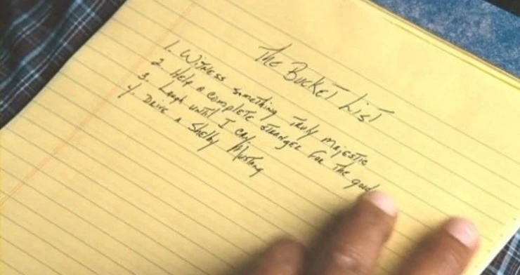 영구 문신하기, 스카이 다이빙하기, 오토바이로 만리장성 일주, 아프리카 세렝게티 초원에서 사자 사냥하기, 최고의 미녀와 키스하기 등등으로 뭔가 커다란 인생의 목표를 적는 것이라기보다 평소에 못해보았던 일탈적인 경험들과 얼핏 들으면 피식 웃어넘길 법한 허무맹랑한 것들도 리스트에 올라 있었기에 이 리스트들을 어떻게 실행해 나갈지 지켜보는 재미가 참 쏠쏠했던 것 같다.